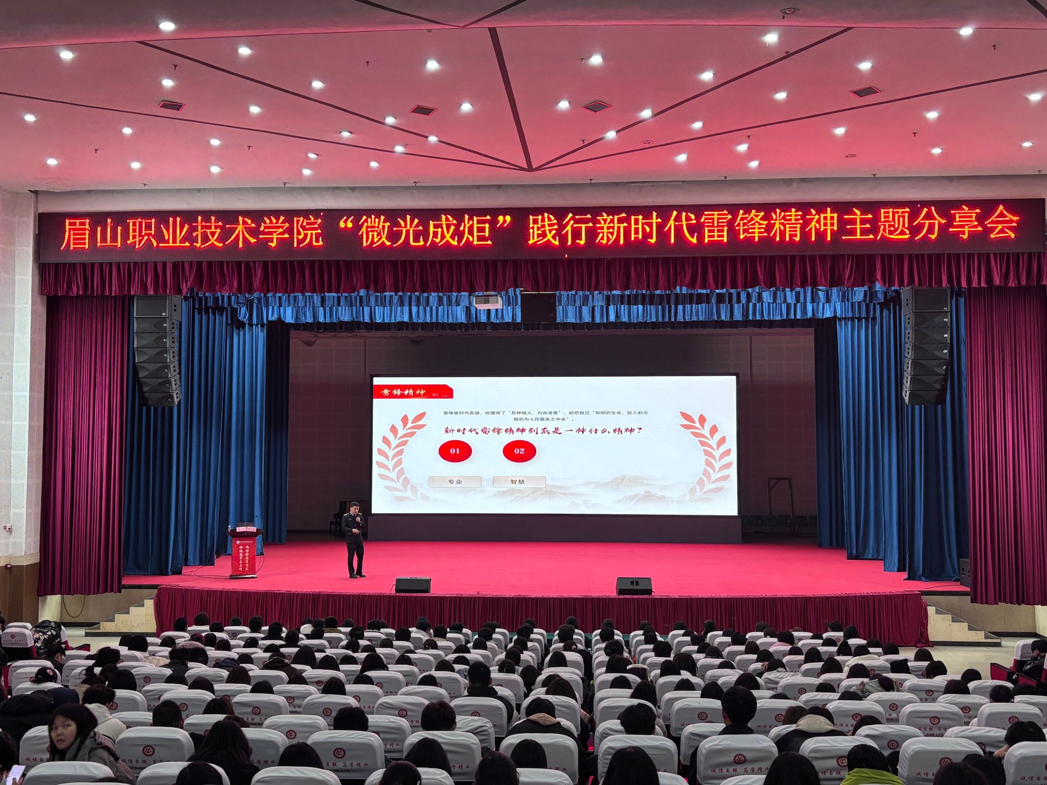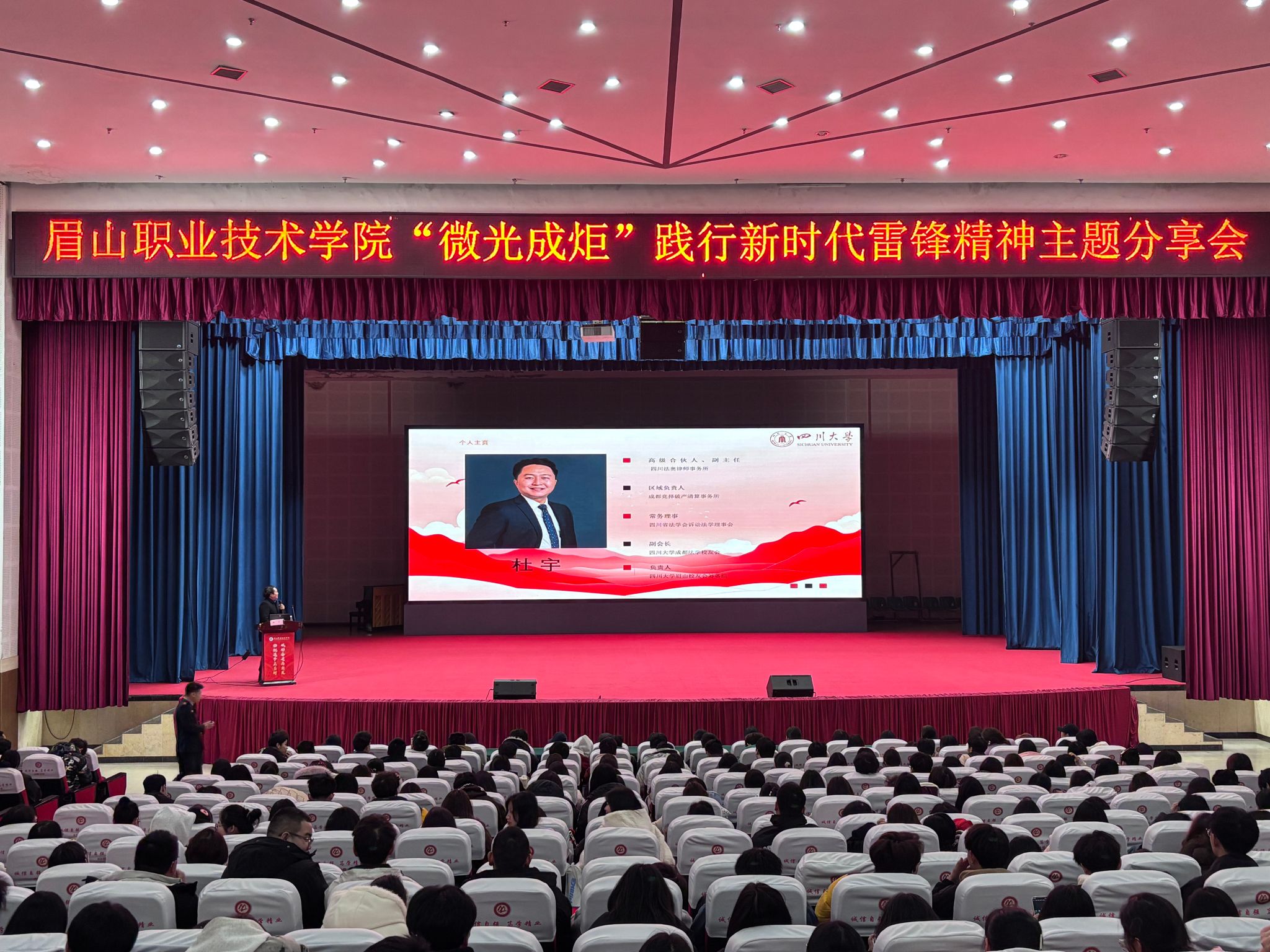 杜宇则以“微光成炬,在日行一善中传承雷锋精神”为题,从身边小事的角度阐释了新时代雷锋精神的核心价值。杜宇提到:“从‘一平方米’点燃微光。”他分享了当代大学生如何从身边小事入手,做好“一平方米”的善行实践。他对现场的眉职学子提出殷切期望,希望大家在日常生活中养成善行习惯,传承好雷锋精神。