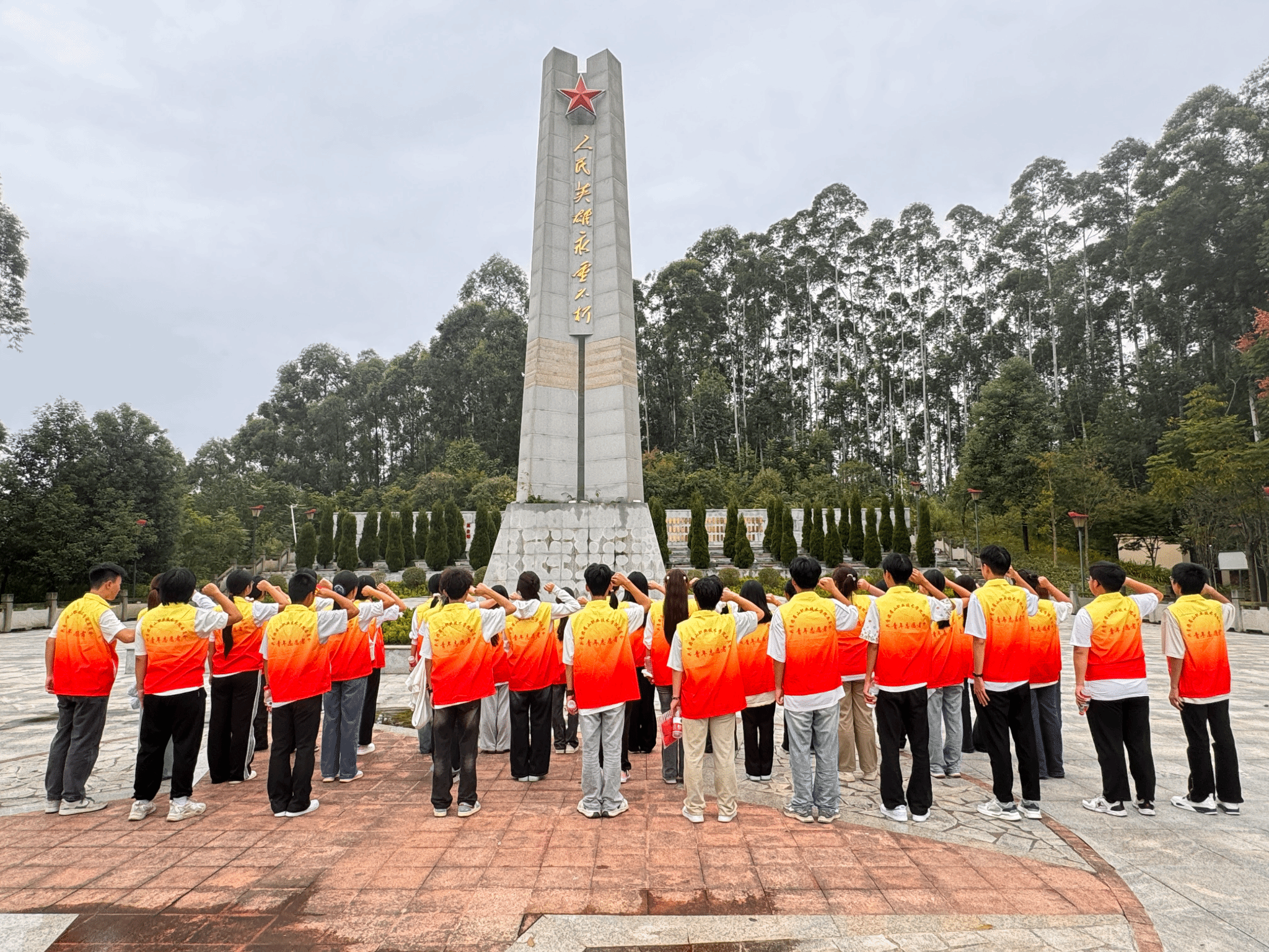 随后,全体团员沿着215级台阶拾级而上,抵达庄严肃穆的烈士纪念碑前。在巍峨的丰碑下,同学们整齐列队、静默致哀,并面向团旗庄严宣誓,重温入团初心。铿锵誓言回荡在纪念广场上空,彰显出新时代青年继承先烈遗志、勇担时代重任的坚定决心。