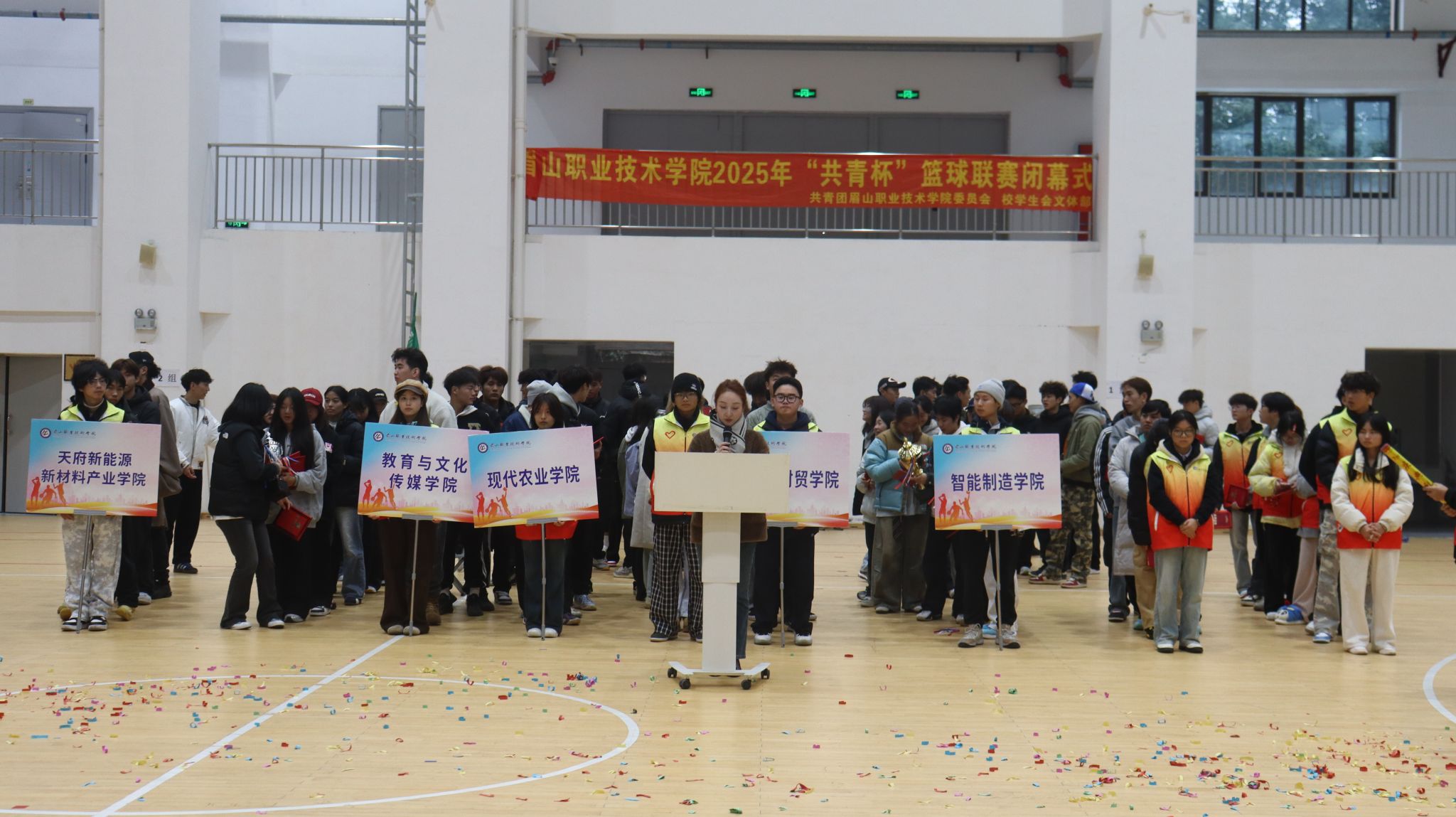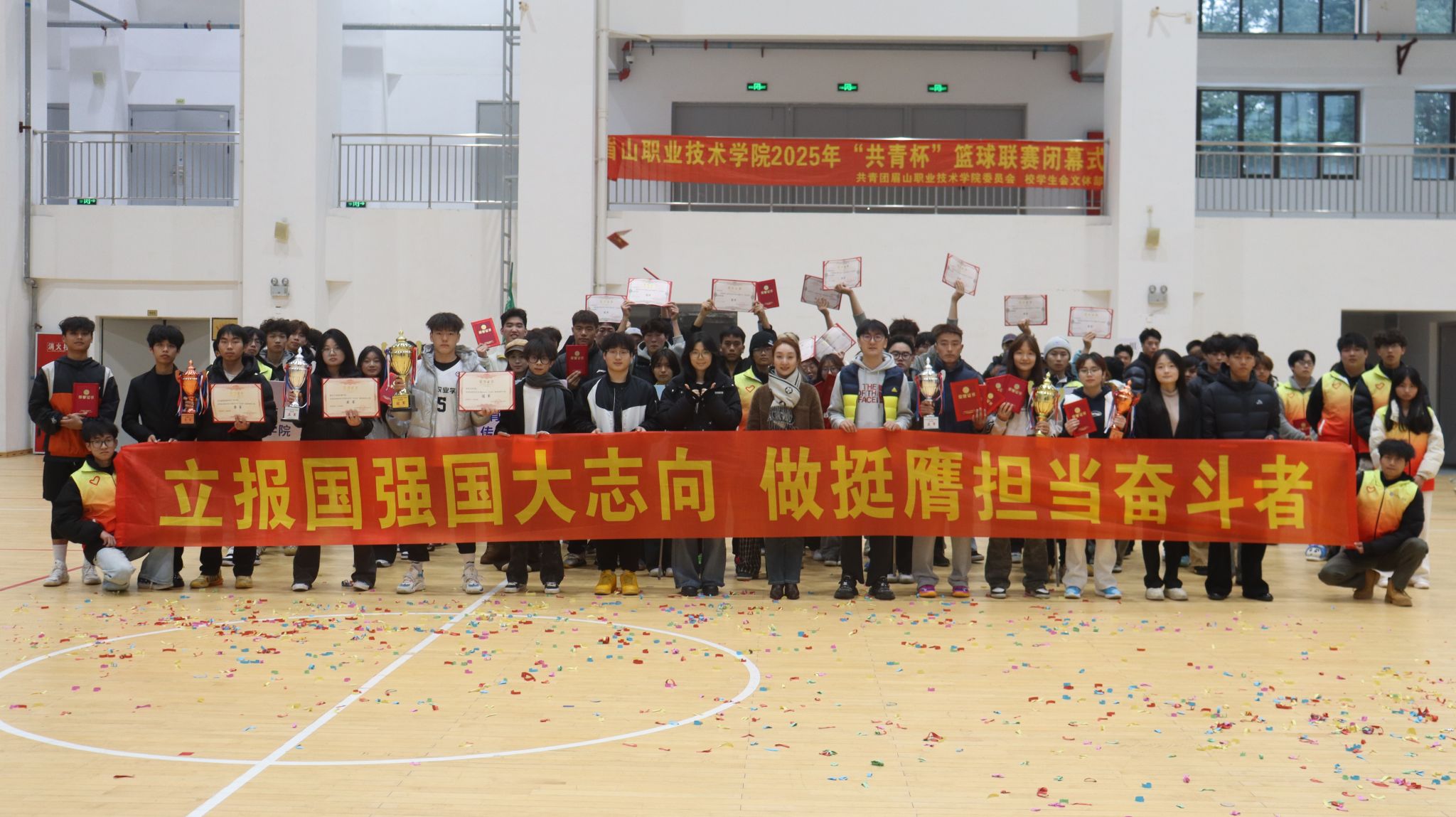 12月1日下午,2025年眉山职业技术学院“共青杯”篮球联赛闭幕式在学校体育馆隆重举行。