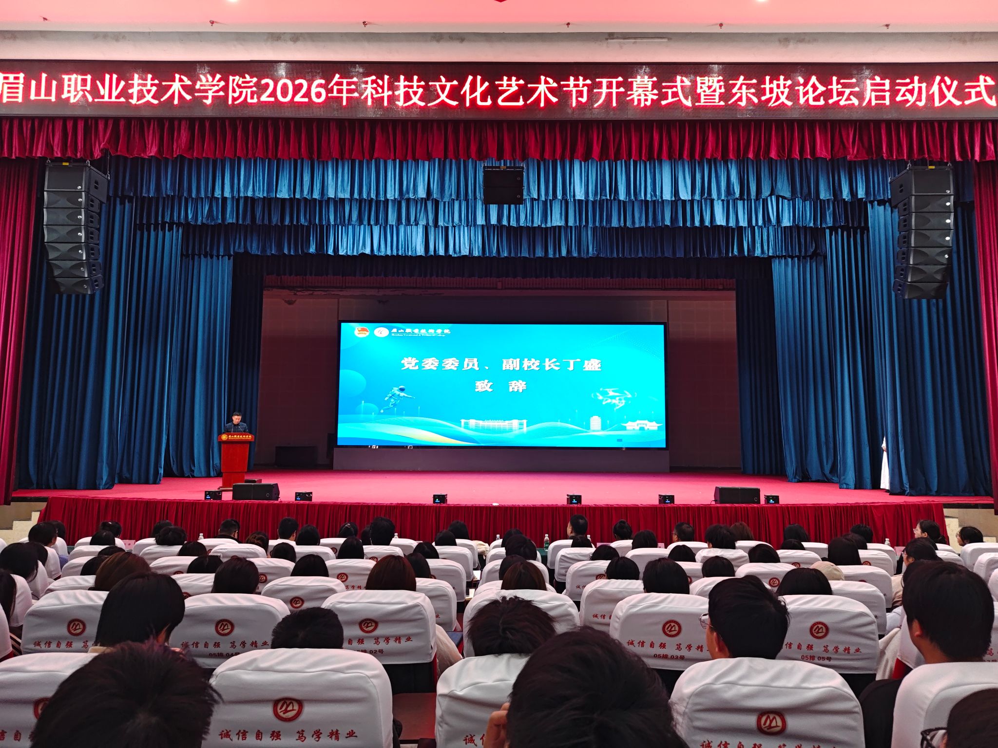 丁盛代表学校向精心筹备本次活动的工作人员表示衷心感谢,向踊跃参与的全体师生致以诚挚问候。他表示,科技与艺术的融合是时代发展的必然趋势,文化自信是民族复兴的精神支撑。作为扎根东坡故里的高职院校,学校始终秉承“立德树人”根本任务,连续多年举办科技文化艺术节,致力于打造“科技赋能、文化铸魂”的育人平台。丁盛寄语全体师生,要勇担时代使命,将个人成长融入国家发展大局,在实践中锤炼本领、在创新中追求卓越,努力成为德智体美劳全面发展的新时代青年。
