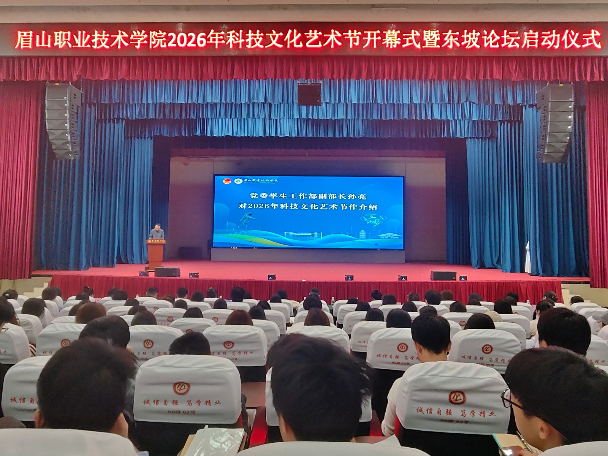 4月13日,学校2026年科技文化艺术节开幕式暨东坡文化论坛启动仪式在艺术中心举行。学校党委委员、副校长丁盛出席活动并致辞。党委学生工作部副部长孙亮对科技文化艺术节作介绍。仪式由团委副书记李青青主持。