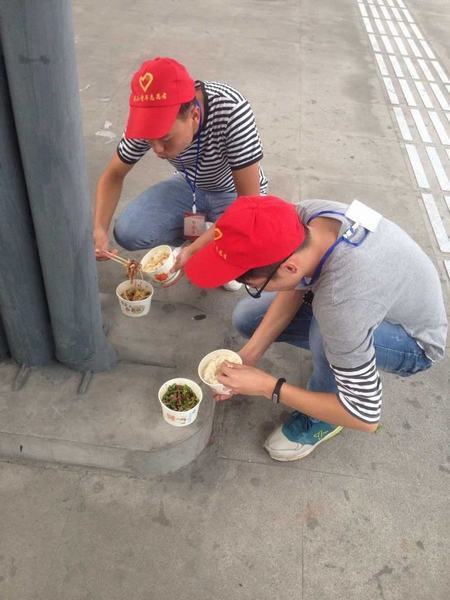 辛苦的志愿者在吃“迟来的午餐”