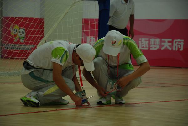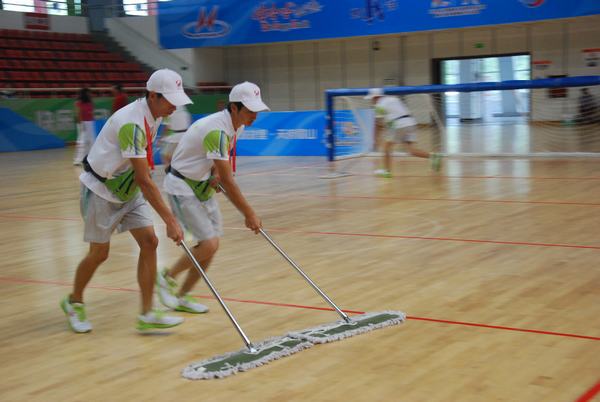 盲人门球全场比赛时间为20分钟,分上下半场,各10分钟,半场间歇3分钟。每场门球比赛间歇休息时,我院门球场地志愿者就会拿起拖把,迅速冲入赛场,擦干场地,观众都称他们为“拖地哥”。他们每天负责八场比赛,一场比赛至少来回要拖10次,看似简单的工作,要求极高,动作要快、反应灵活、时间控制在8-10秒内。为了防滑,他们必须及时将赛场上的汗水擦干,防止运动员受伤。