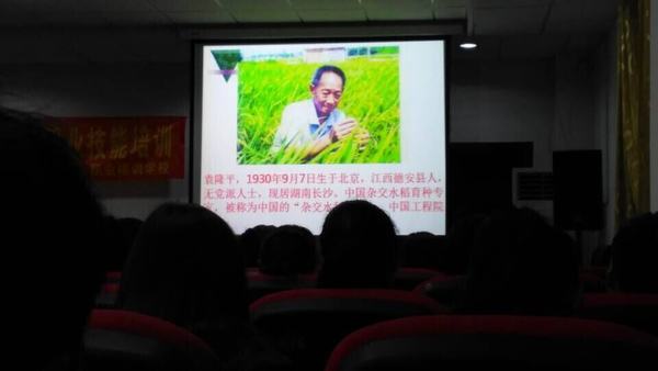 (专题讲座中展示袁隆平在稻田中采集样本)