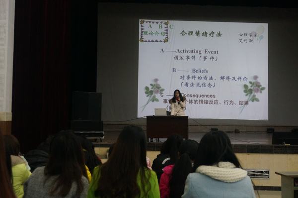 陈微老师在讲座中,利用心理案例分析,通过老婆婆为儿子的生意操心的故事和《秀才赶考》的故事,则说明同一件事如果有不同的看法,也会影响到情绪和事物的发展;随后的爱神维纳斯将小猫变成美女的故事,则说明模样变了并不证明心态的改变,只有思维模式的转变才是真正的转变;我们不能改变历史,但可以将非理性的看法变为理性的看法,对小A同学挂科的案例分析就说明了这一点。在讲座过程中,陈微老师播放了多个短视频,并在看完视频后与同学们进行互动,各同学表达了自己的看法,会场一时热闹非常,在一片轻松诙谐的气氛中,陈微老师结束了她的演讲。