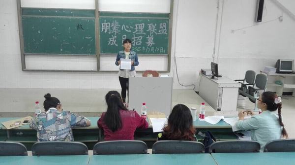 朋辈心理联盟是由院团委领导,协助学院进行学生心理健康咨询和心理疏导的社团协会。本次参与面试工作的评委有院团委副书记袁娇、师范教育系心理学老师赵雪梅、冯涛、田璐。此前,朋辈心理联盟协会在学院食堂门口进行了大量的协会宣传工作,耐心细致地为同学们讲解了各种问题和本协会的组织意义,近百位对此有兴趣的同学参加了协会的预报名。本次面试,同学们积极展示自己的才华,现场进行的井然有序,最终评委老师挑选了13名优秀同学进入朋辈心理联盟协会。
