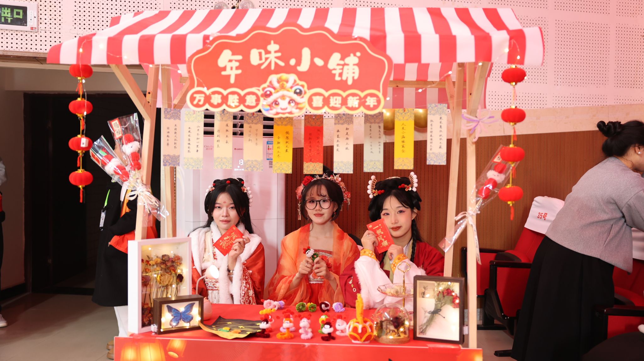 在艺术中心外,怀瑾汉服社社员们身着精致的汉服,翩翩起舞,用古典的舞姿演绎着节日的浪漫与美好。表演结束后,社员们还热情参与元旦晚会年味小铺的运营,将温暖传递给每一位观众。
