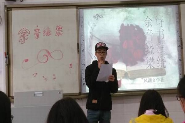 本次活动由风潮文学社社长彭浩主持,由吉他协会为大家带来吉他弹唱,活跃了会场气氛,反映了本次活动是音乐与文学相互交融的活动。随后,教室里播放婉转动听的音乐,有古风的《芙蓉雨》、《枕上书》,有弹唱的《南山南》,也有韵味特别的《猪老三》等歌曲,并对自己所选的歌曲进行PPT讲解,讲述诗书与音乐结合的独特之美,并且和大家一起交流,让大家发表各自对歌曲的见解。最后,由会长做活动总结,并且给表现优秀的同学颁发奖品。