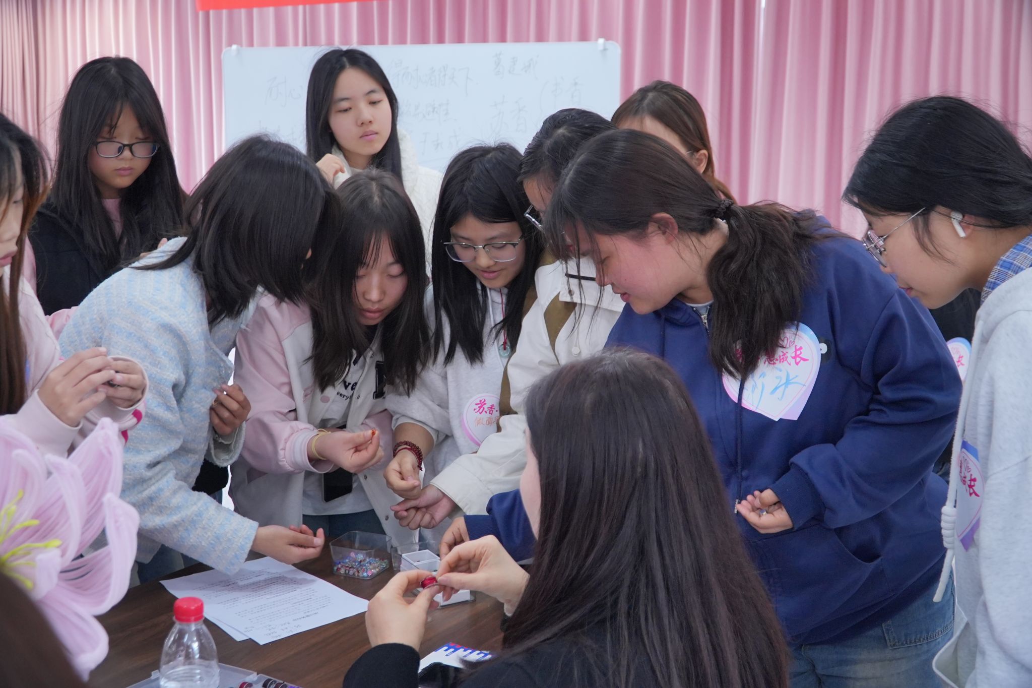 活动前期,学校以电子 “织梦邀请函” 开启招募,女生通过扫码报名、答题遴选的方式择优参与,充分激发了大家的参与热情与期待感。活动伊始,别具匠心的 “共织苏香” 签到环节让现场暖意融融,同学们手持彩色丝线,精心缠绕 “苏” 字木板,以丝线为媒,共绘项目美好开篇,也让 “苏香” 文化底蕴在指尖悄然传递。