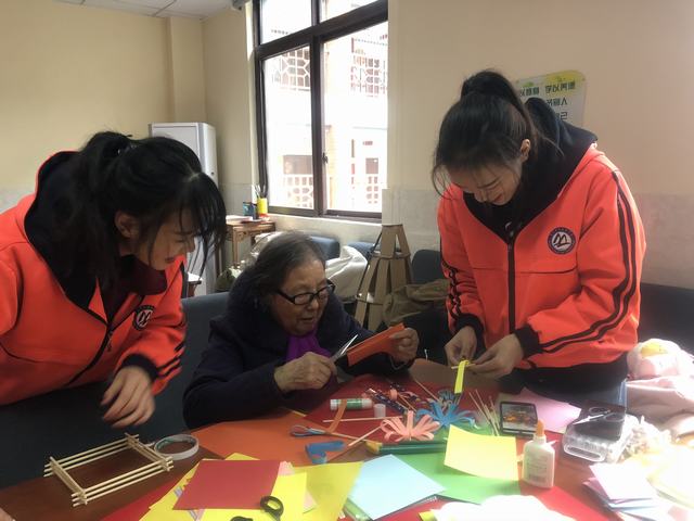 活动中,志愿者为大家分发剪纸工具,详细地给老人们介绍剪纸的方法和技巧,让老人们了解了剪纸的艺术特色;同学们认真地为老人们做示范,和老人们从最基本的剪纸技法做起,创作出的作品色彩亮丽,形态各异,整个活动老人们相互讨论、研究,志愿者也都耐心帮忙,现场气氛温馨祥和,欢声笑语不断。