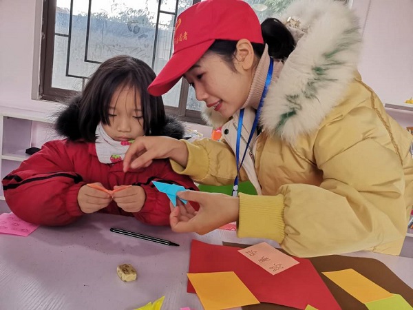 活动期间,志愿者们以宣传展板为载体,将绘画好的图纸作品进行展览,并对作品的含义及绘制方法进行细致的讲解,一张张精美绝伦的优秀作品引发小朋友们强烈的好奇心,激发小朋友们自己动手创作的欲望;在志愿者带领下,小朋友们互帮互助,相互交流,在彩色卡纸与水彩的交替碰撞下,一幅幅充满童趣的图画随之诞生,为活动增添了绚丽的一笔。此外,志愿者借助多媒体播放红军长征视频,并通过视频教授孩子们演唱《红星闪闪》《我爱北京天安门》等红歌,小朋友们热情高涨,踊跃参与其中。