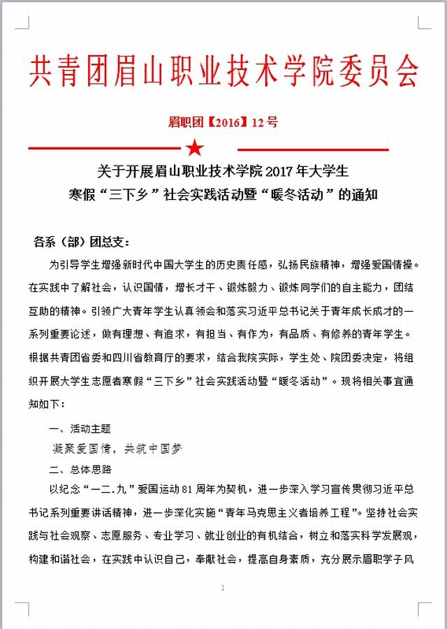 关于开展眉山职业技术学院2017年大学生寒假“三下乡”社会实践活动暨“暖冬活动”的通知