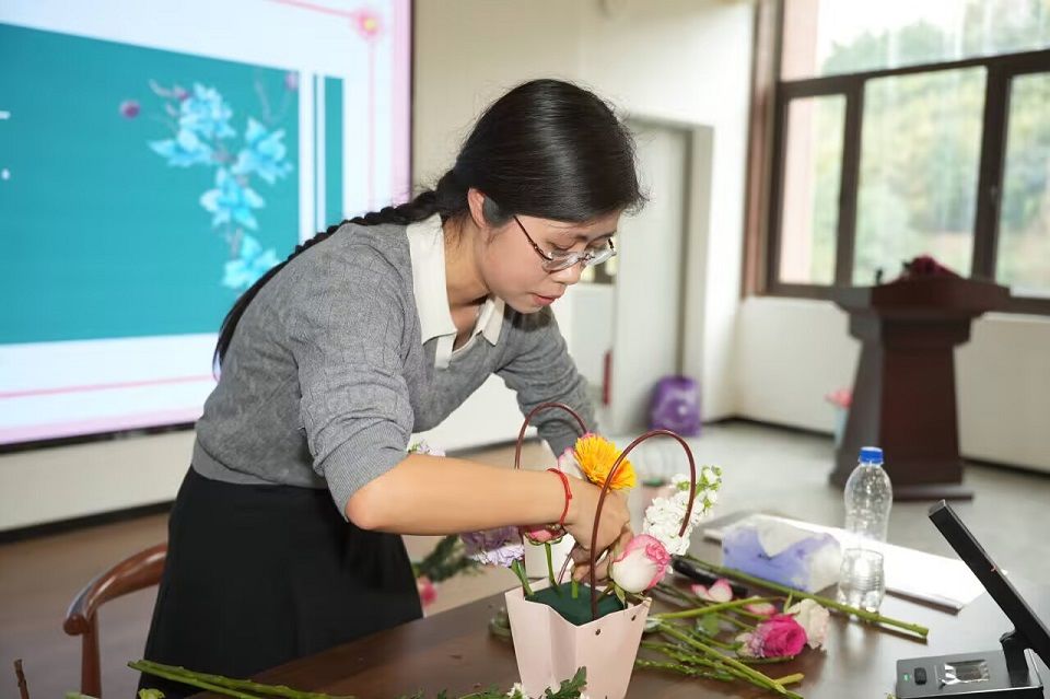 实操体验环节,参训职工在教师指导下动手制作花艺作品,李佳芳逐一指导、细致纠正,现场氛围轻松有序。