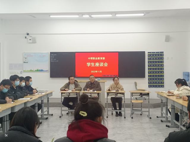 12月3日中等职业教育部在5511教室召开学生座谈会,会议由党总支副书记余志刚主持,李卓桃、牟韬两位老师及30余名学生代表参加会议。