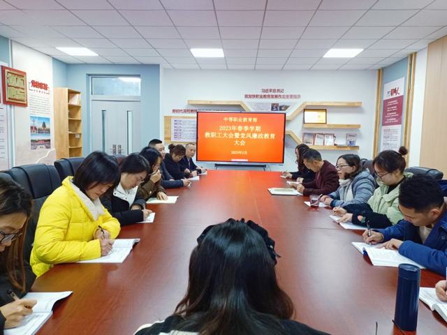 2月12日,中等职业教育部在党建活动室召开2023年春季学期教职工大会暨党风廉政建设教育大会。会议由党总支书记余志刚主持,中等职业教育部全体教职工参加会议。
