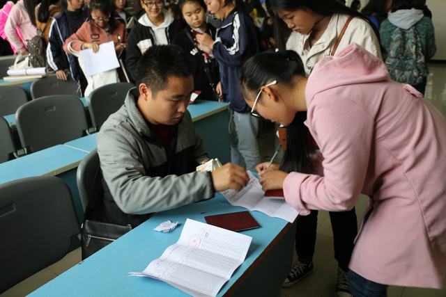 随后,在工作人员余明老师、郑丽老师的指导下,辅导员赵小梅组织各班学生持相关有效证件有序排队领取中职资助卡。
