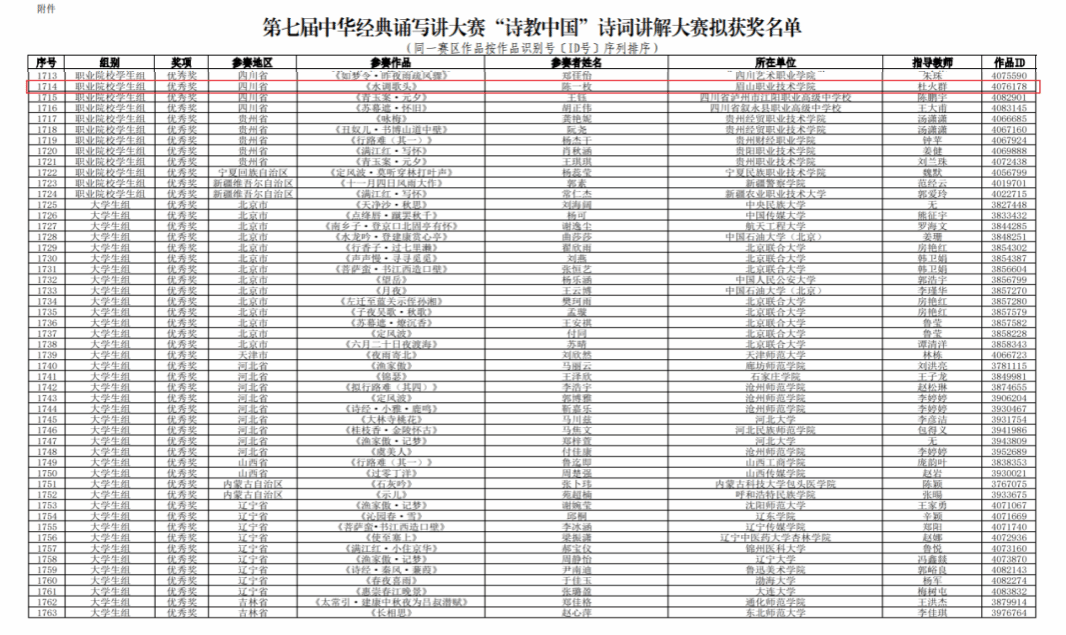 近日,第七届中华经典诵写讲大赛“诗教中国”诗词讲解大赛拟获奖名单正式公布,技师教育学院(中职部)在此项赛事上首次突破国家级奖项,选送的学生作品《水调歌头》荣获职业院校学生组全国优秀奖,四川省仅4所职业院校斩获该项殊荣。
