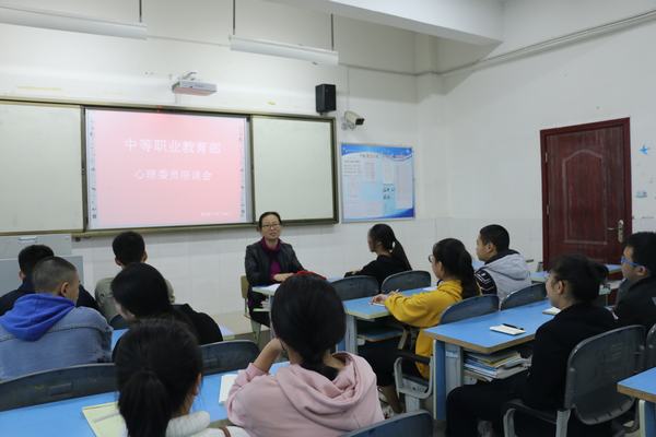 2018年10月24日下午4点30分,中等职业教育部在2601教室举行了心理委员座谈会,会议由中职部党总支副书记陈菊仙主持,各班心理委员参加了此次会议。
