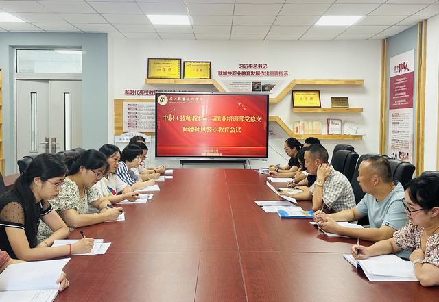 9月13日,中职(技师教育)与职业培训部党总支在党员活动室召开9月政治理论学习暨师德师风警示教育会议,党总支副书记余志刚主持会议并讲话,全体教职工参加会议。