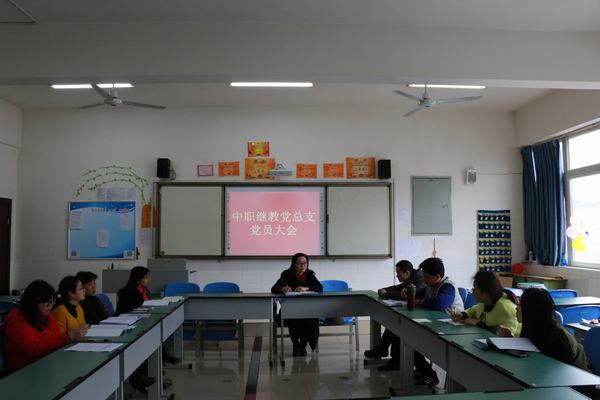 2017年3月16日下午,中职继教党总支在2611教室召开党员大会。中职部党总支副书记陈菊仙、副主任余莲君、继续教育培训部黄文清主任及全体党员同志参加了本次会议。会议由陈菊仙副书记主持。