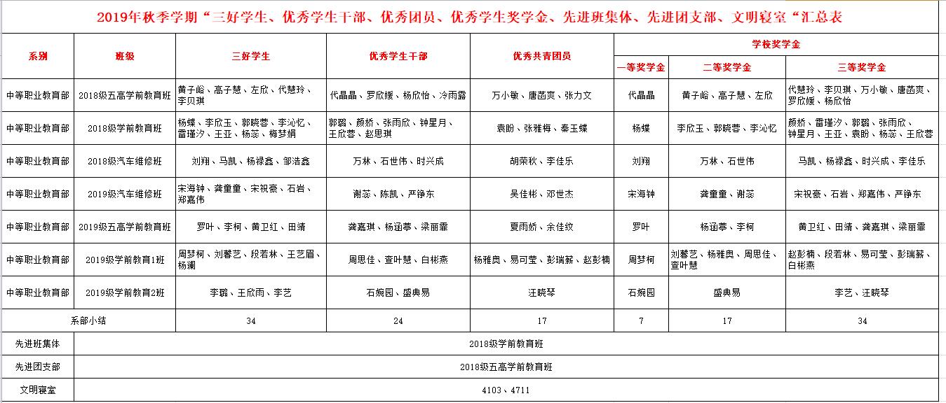 根据《眉山职业技术学院关于2019年秋季学期评先选优实施方案》【眉职学(2020)1号】文件要求,本着“公平、公正、公开”的原则,我系(部)评选出2019年秋季学期“三好学生”34名、“优秀学生干部”24名、“优秀共青团员”17名、“一等奖学金”7名、“二等奖学金”17名、“三等奖学金”34名、“先进班集体”1个、“先进团支部”1个、“文明寝室”2个。