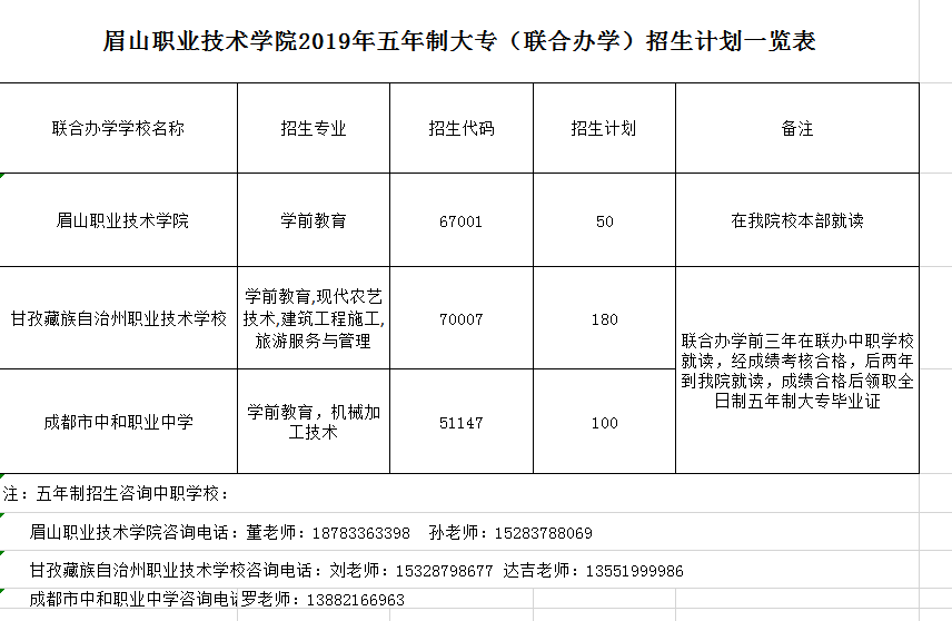 眉山职业技术学院2019年五年制大专(联合办学)招生计划一览表