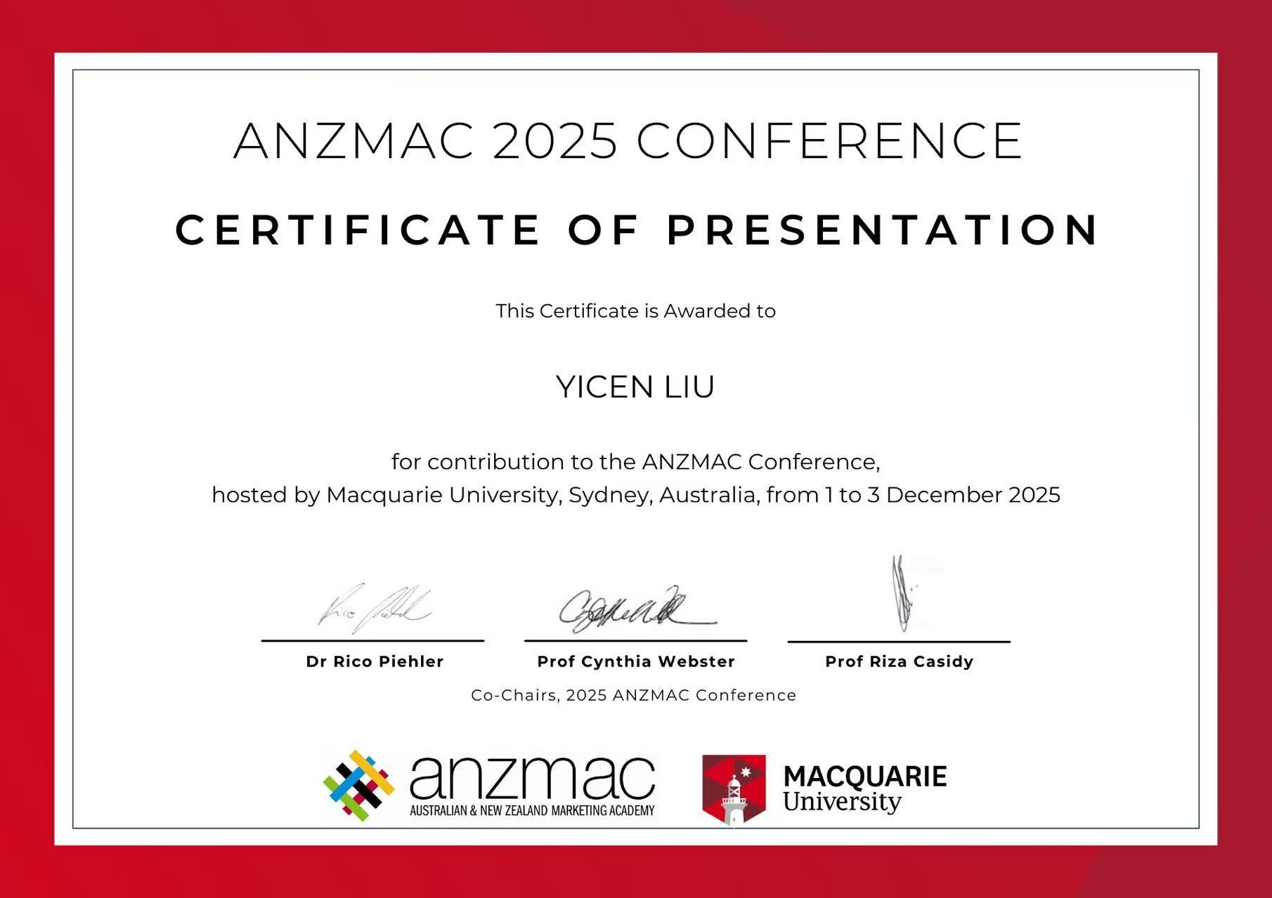 会议期间,刘怡岑博士担任分会场主席(会场主题:Influencer Marketing and Ethics),并作题为 Reframing Influencer Value: A Well-Being Lens 的论文演讲,充分展示其在网红价值与消费者福祉研究领域的最新成果。