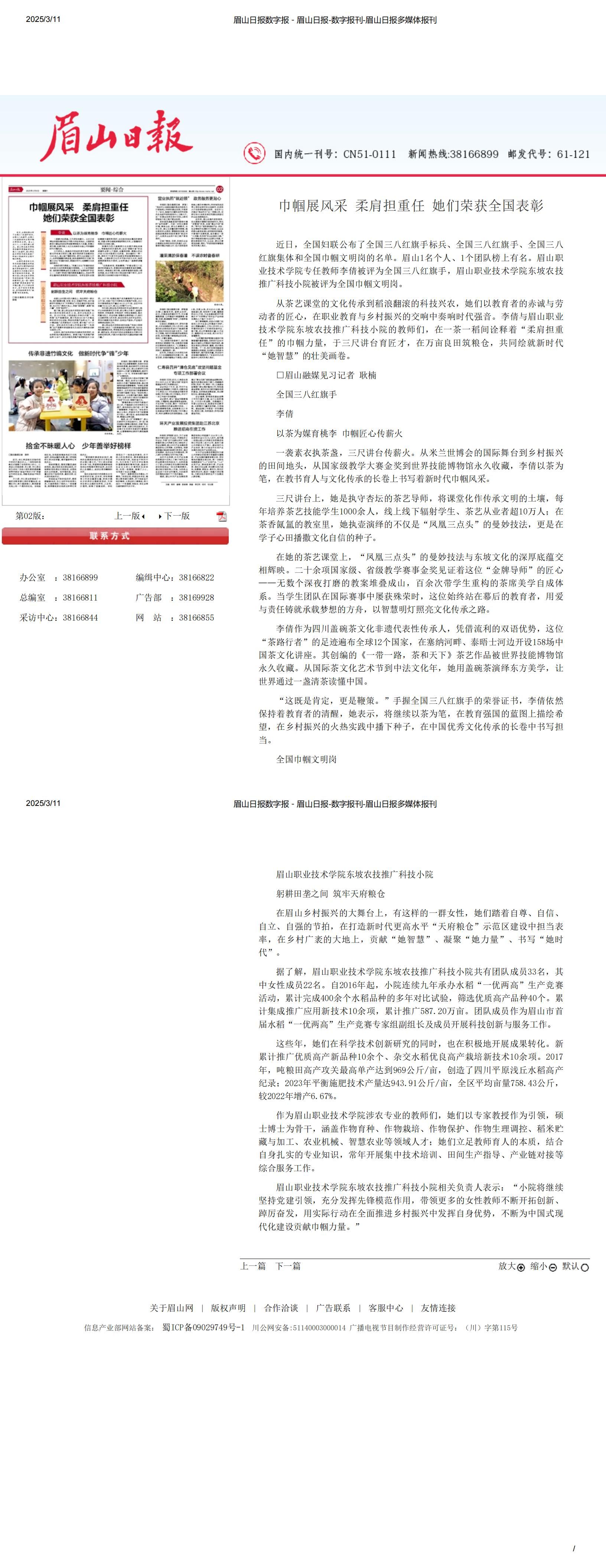 从茶艺课堂的文化传承到稻浪翻滚的科技兴农,她们以教育者的赤诚与劳动者的匠心,在职业教育与乡村振兴的交响中奏响时代强音。李倩与眉山职业技术学院东坡农技推广科技小院的教师们,在一茶一稻间诠释着“柔肩担重任”的巾帼力量,于三尺讲台育匠才,在万亩良田筑粮仓,共同绘就新时代“她智慧”的壮美画卷。