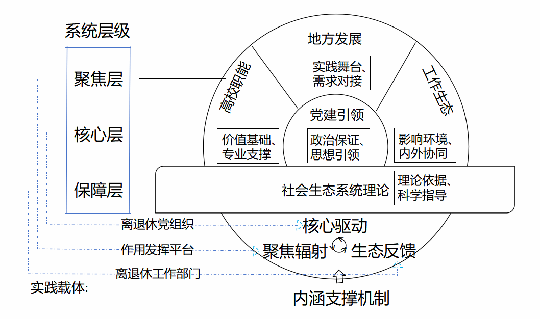 构建科学合理的理论框架是指导退休教师党员职业价值延续实践的基础,本文提出的“以党建引领为核心,聚焦高校职能、聚焦地方发展、聚焦工作生态”工作模式以党建引领为引擎,通过三大聚焦领域实现银龄力量的精准释放,最终达成"离岗不离党、退休不褪色"的价值目标。