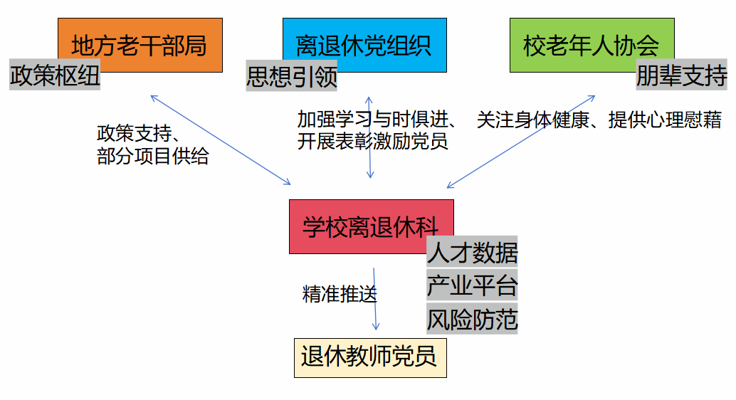 通过专项拨款建设离退休党员活动阵地打造“学习型”离退休党总支,试点特色兴趣型党小组;设置“银龄养老服务队”强化校老年人协会服务功能;以学校组织人事部离退休科为枢纽,加强自身建设,设置离退休专项经费保障,完善风险防控、发展激励制度;对接地方老干部局探索“四维融合”的管理服务体系,在中观系统构建提振“驱动力”的组织生态。