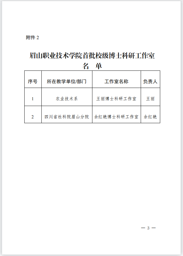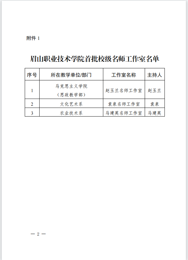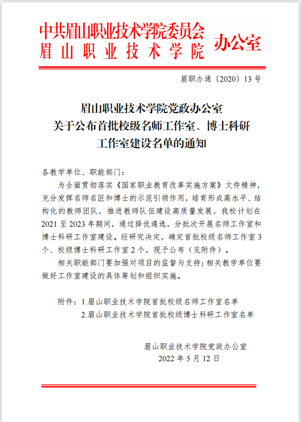 眉山职业技术学院党政办公室关于公布首批校级名师工作室、博士科研工作室建设名单的通知