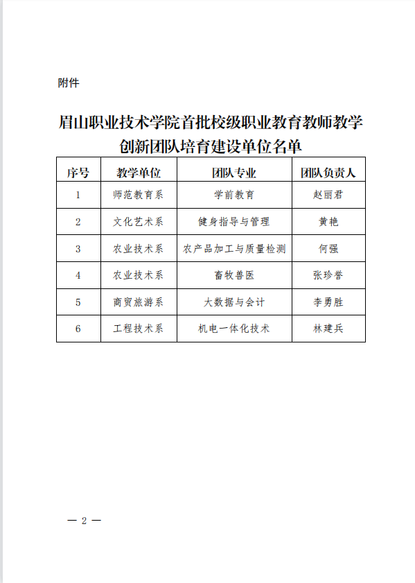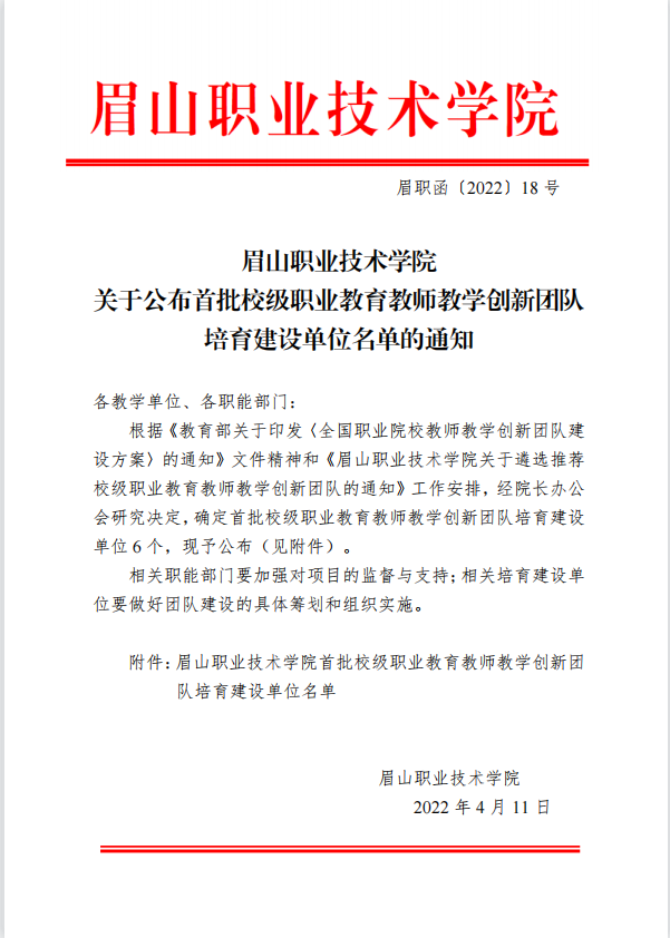 眉山职业技术学院关于公布首批校级职业教育教师教学创新团队培育建设单位名单的通知